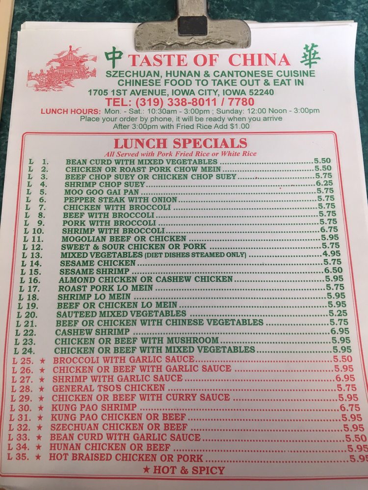 Introducing the menu at Taste of China Chinese Restaurant, located in Iowa City, offers a wide range of appetizers such as spring rolls, dumplings, and BBQ spare ribs. Their soup selection includes classics like wonton soup and hot and sour soup. Chow mein options feature various meats and vegetables. Customers rave about the friendly service, quick delivery, and delicious food, with favorites like wonton soup, steamed pork dumplings, and sweet and sour pork. The restaurant is praised for its large portions at great prices, making it a go-to spot for Chinese cuisine in Iowa City. Taste of China is known for its authentic flavors and quality ingredients, providing a satisfying dining experience for all customers.